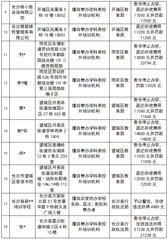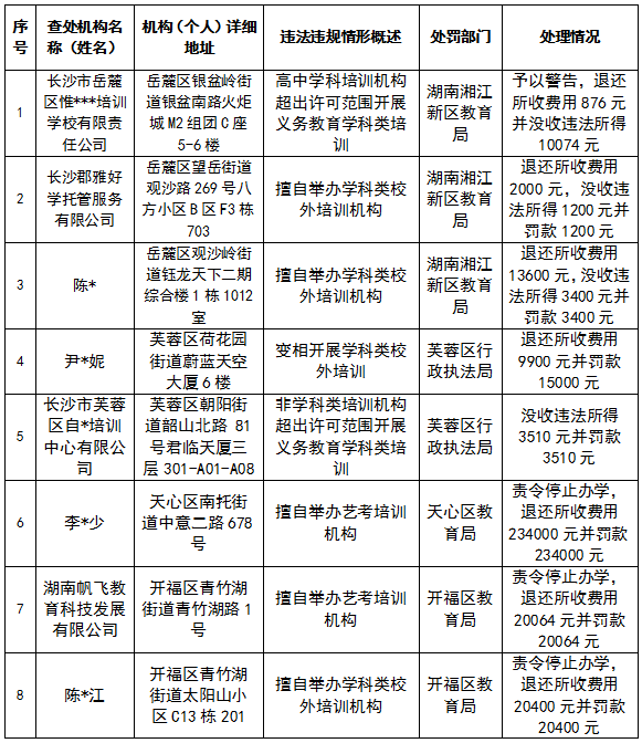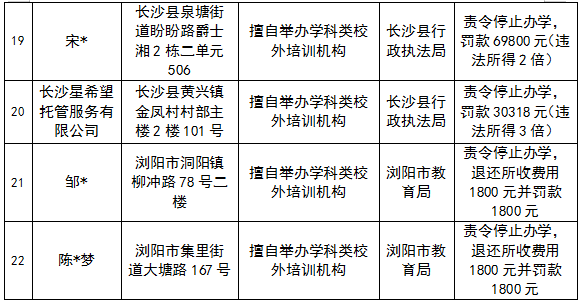 现将行政处罚情况予以通报,希望长沙市各校外培训机构从业人员引以为戒,强化自律意识,坚持依法依规、诚信经营;同时,也提醒广大家长和学生提高辨别能力,加强防范意识,积极参与监督举报,共同营造良好的教育生态。