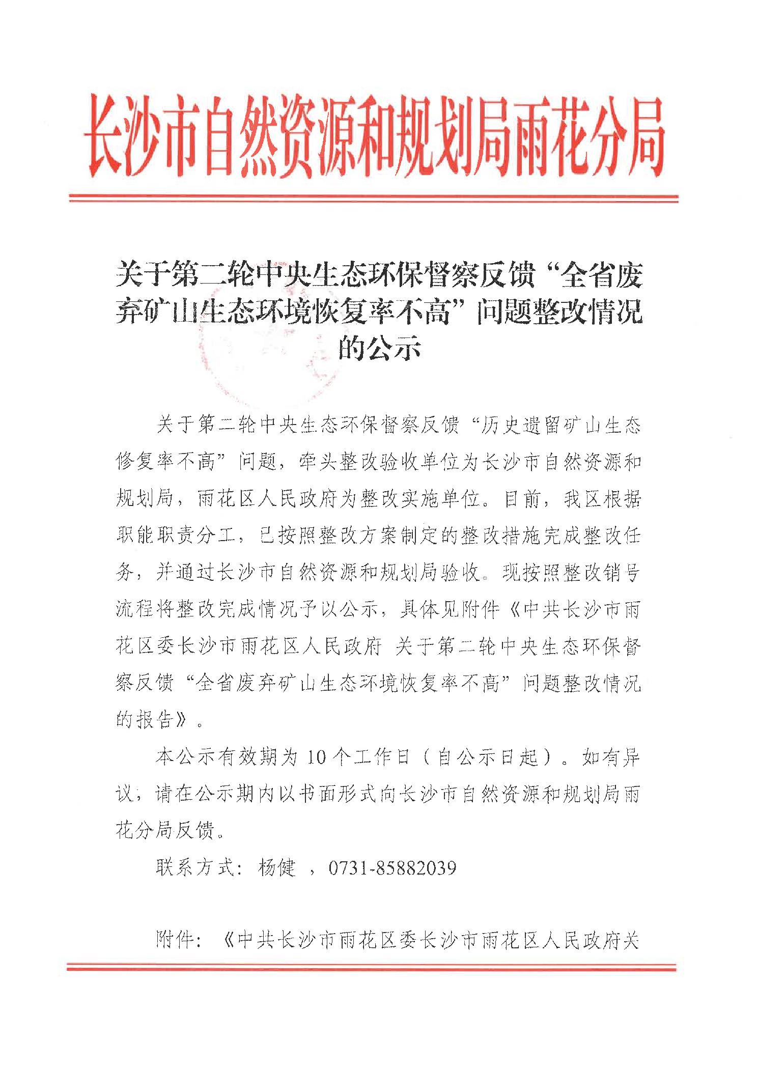 中共长沙市雨花区委长沙市雨花区人民和记AG关于第二轮中央生态环保督察反馈“全省废弃矿山生态环境恢复率不高”问题整改情况的报告.pdf