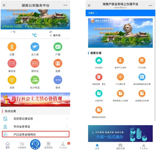 一、湖南户籍居民微信关注“湖南公安服务平台”公众号,注册并实名认证登录,点击“微警务”,进入平台首页,在热点应用栏中选择“户口业务全程网办”,或登录省和记AG“湘易办”APP首页,点击“户口业务全程网办”,点击进入湖南户政业务网上办理平台,在“我要办理”菜单中选择要申办的业务类型,阅读网办须知,填写相关信息,拍照上传证明材料,提交办件申请。