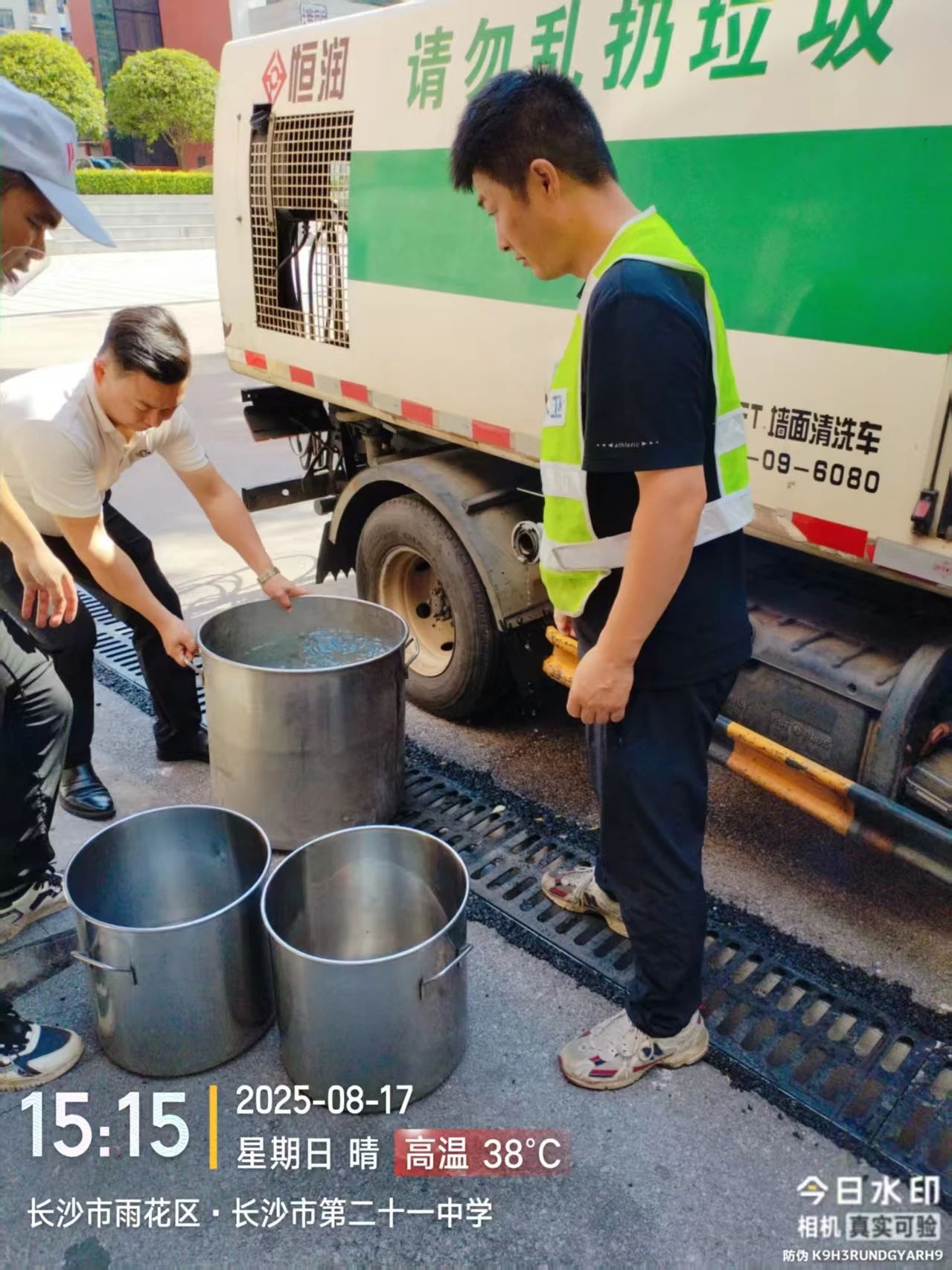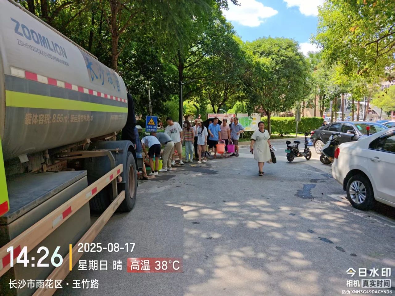 8月17日上午,因猴子石水厂突发故障,雨花区部分小区及周边区域出现水压骤降、水量锐减甚至停水情况,居民用水面临困难。雨花区环卫中心迅速启动应急响应,主动调度洒水车为受影响区域提供应急用水保障。