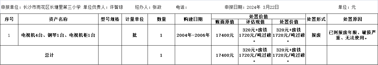 长沙市雨花区长塘里第三小学因资产核销所涉及电视机、钢琴、电视机柜资产需处置(核销),根据《雨花区行政事业单位国有资产管理实施细则》(雨财发〔20237号)等文件精神,向社会公示。按照该文件要求,现将长沙市雨花区长塘里第三小学所需处置(核销)的资产信息、现场勘查等情况(详情见下表),予以公示,20241122日至20241128