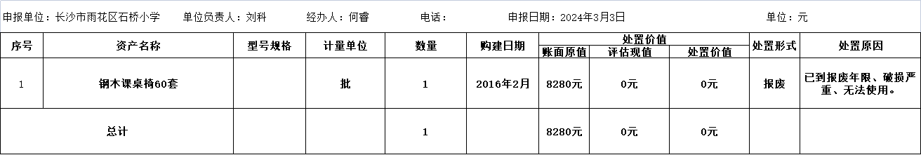 长沙市雨花区石桥小学因资产核销所涉及钢木课桌椅资产需处置(核销),根据《雨花区行政事业单位国有资产管理实施细则》(雨财发〔20237号)等文件精神,向社会公示。按照该文件要求,现将长沙市雨花区石桥小学所需处置(核销)的资产信息、现场勘查等情况(详情见下表),予以公示,公示时间为20241122日至20241128