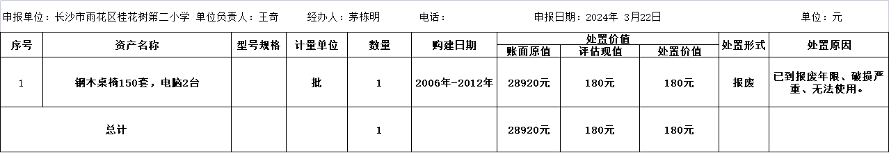 长沙市雨花区桂花树第二小学因资产核销所涉及钢木桌椅、电脑资产需处置(核销),根据《雨花区行政事业单位国有资产管理实施细则》(雨财发〔20237号)等文件精神,向社会公示。按照该文件要求,现将长沙市雨花区桂花树第二小学所需处置(核销)的资产信息、现场勘查等情况(详情见下表),予以公示,公示时间为20241122日至20241128
