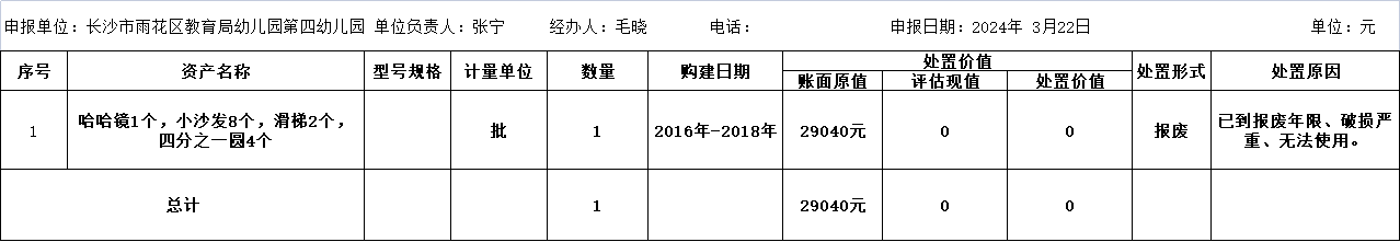 长沙市雨花区教育局幼儿园第四幼儿园因资产核销所涉及哈哈镜、小沙发、滑梯、四分之一圆资产需处置(核销),根据《雨花区行政事业单位国有资产管理实施细则》(雨财发〔20237号)等文件精神,向社会公示。按照该文件要求,现将长沙市雨花区教育局幼儿园第四幼儿园所需处置(核销)的资产信息、现场勘查等情况(详情见下表),予以公示,20241122日至20241128