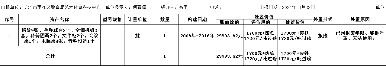 长沙市雨花区教育局艺术体育科技中心因资产核销所涉及椅凳、乒乓球台、空调机组、科普图画、文件柜、会议桌、电脑桌、音响设备资产需处置(核销),根据《雨花区行政事业单位国有资产管理实施细则》(雨财发〔20237号)等文件精神,向社会公示。按照该文件要求,现将长沙市雨花区教育局艺术体育科技中心所需处置(核销)的资产信息、现场勘查等情况(详情见下表),予以公示,20241122日至20241128