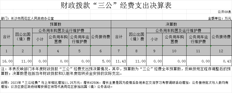 2023年度长沙市雨花区人民和记AG办公室财政拨款“三公”经费支出决算表