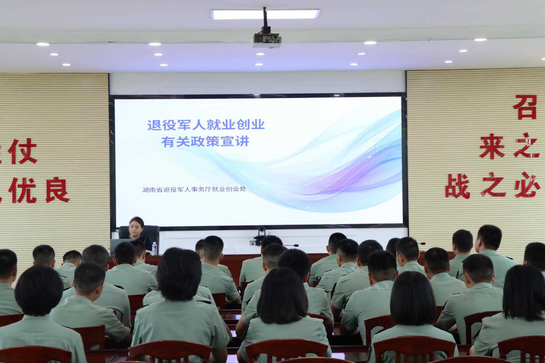 近日,湖南省2025年“送政策进军营”活动在湖南长沙某部队举行,百余名官兵代表参加活动。活动现场,湖南省退役军人事务厅就业创业处有关同志围绕退役军人学历提升、教育培训、就业促进、创业扶持、税收优惠、金融支持等政策进行专业解读和现场答疑,帮助官兵全面了解国家优惠政策,为其退役后的学历提升、职业规划和就业创业提前做好准备,助力官兵顺利实现从军营到社会的华丽转身。