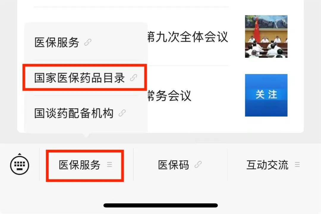 01 进入“长沙医保”微信公众号,点击“医保服务”,找到“国家医保药品目录查询”。