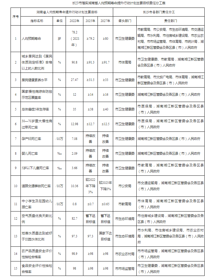 附件:长沙市落实湖南省人均预期寿命提升行动计划主要目标责任分工